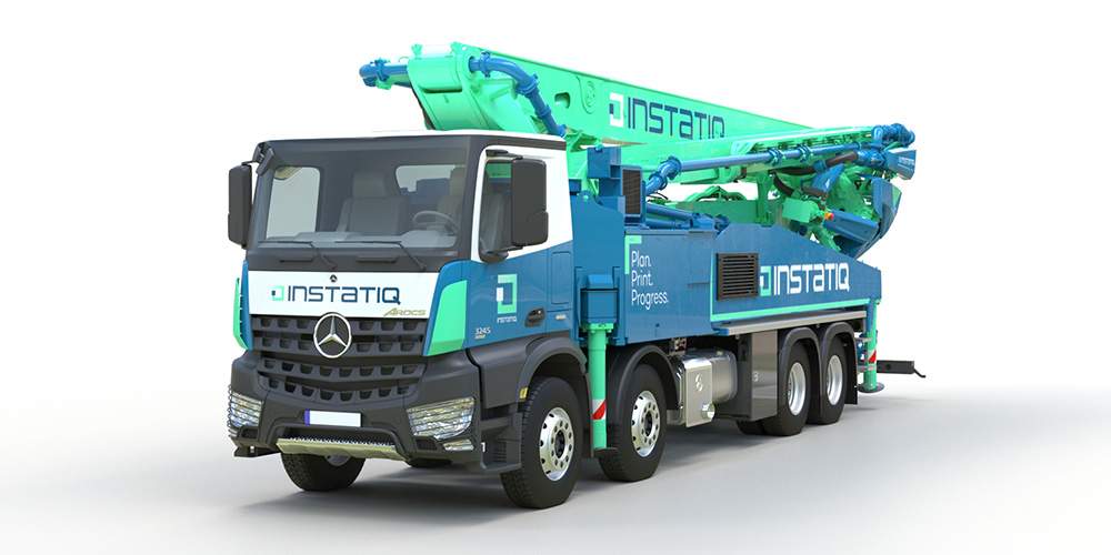 With INSTATIQ P1, concrete walls can be built in a short time – without any conventional formwork and with classic standard concrete! As a highly innovative combination of a mobile concrete pump and precise robot technology, INSTATIQ P1 allows for a quick set-up on the construction site and a highly automated creation of walls. This not only reduces manual labor and safety risks on the construction site, but also enables more efficient and time-saving construction compared to conventional construction methods. In addition, the use of standard concrete with a maximum grain size of 8 mm, which can be supplied from conventional ready-mix concrete plants, creates considerable potential in terms of the cost-effectiveness of the manufacturing process. Sustainability is not neglected either.