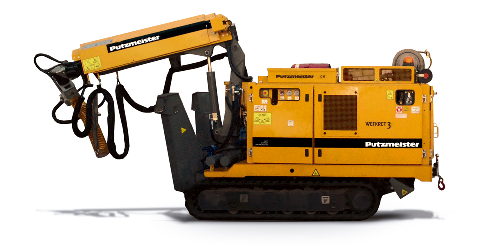 The mechanised concrete spraying system Wetkret 3 is designed for shotcreting in small tunnel sections with difficult access. Mounted on a compact crawler chassis with a 24 hp (17.9 kW) Diesel engine, the equipment features hydraulically operated support legs and an optional +/-30 º tilting system, guaranteeing stable operation in ascending and descending slopes. The telescopic spraying arm with a maximum horizontal reach of approx. 23′ permits working in minimum sections of 8′ 2″ and is operated by remote control (dual use by cable and wireless).